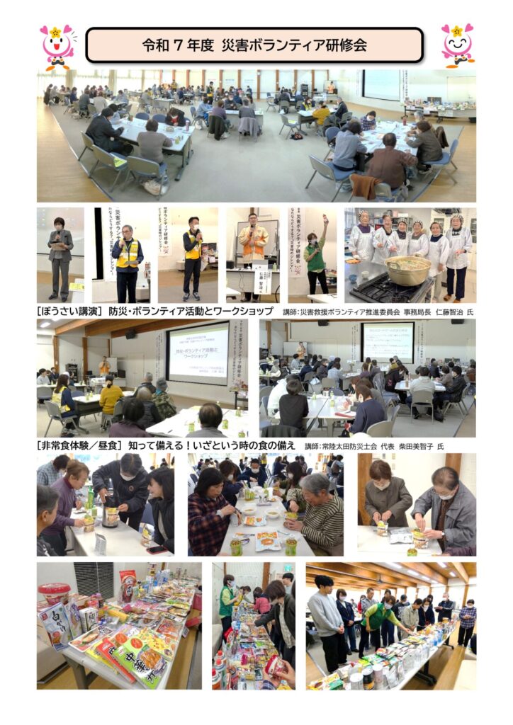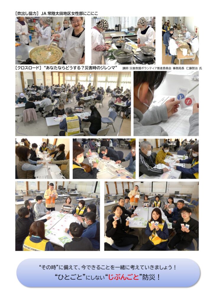 昼食時には、常陸太田防災士会(代表:柴田美智子さん)による非常食体験や、JA常陸太田地区女性部にこにこ(代表:廣木登美枝さん)の皆さんによる炊き出しも行い、災害時の“食”についても学ぶことができました。